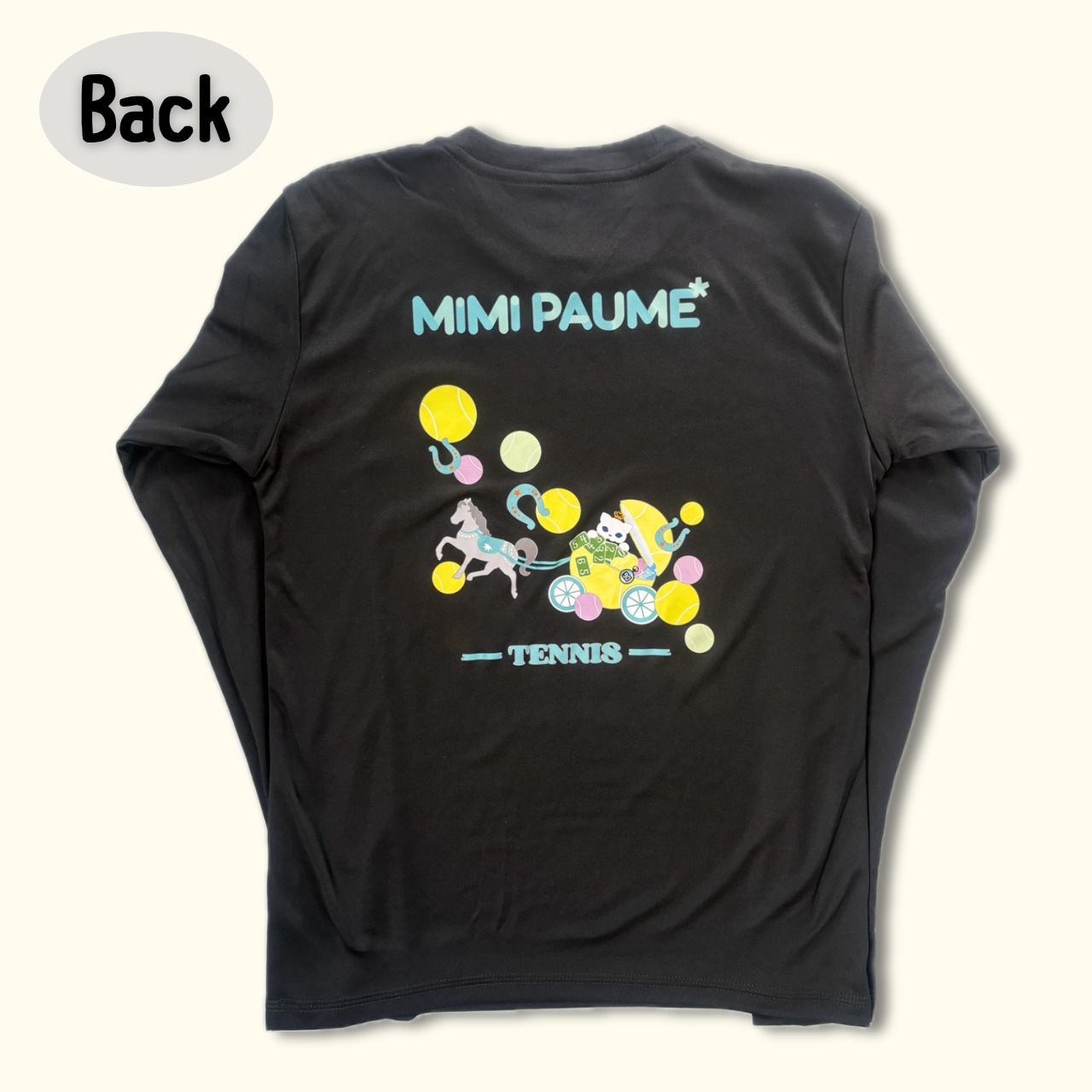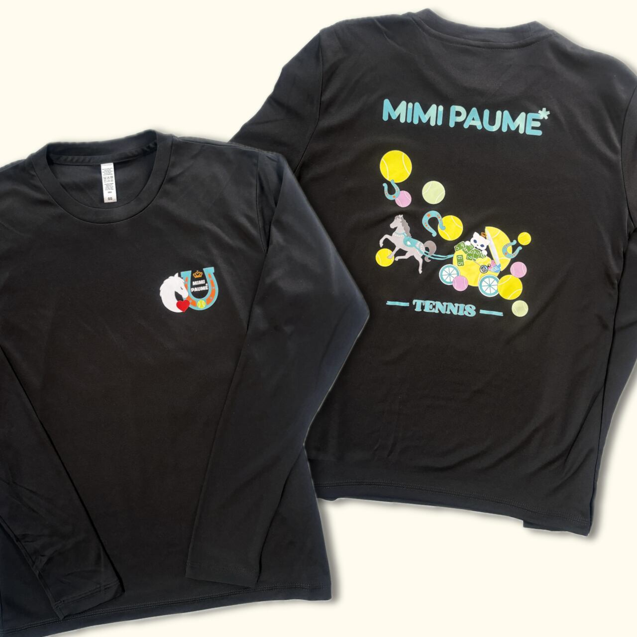ミミポームオリジナルの猫&馬車プリントの、3.5ozインターロックドライ長袖Tシャツです。フロントは馬&蹄鉄、バックプリントはmimi猫を乗せた馬車をデザインしてみました。肌触りの良い素材と、快適な着心地が魅力です。ドライな機能を備えているので、汗を素早く吸収して、乾燥も早いんです。汗ばむ季節でもさらっと快適に過ごせますよ。