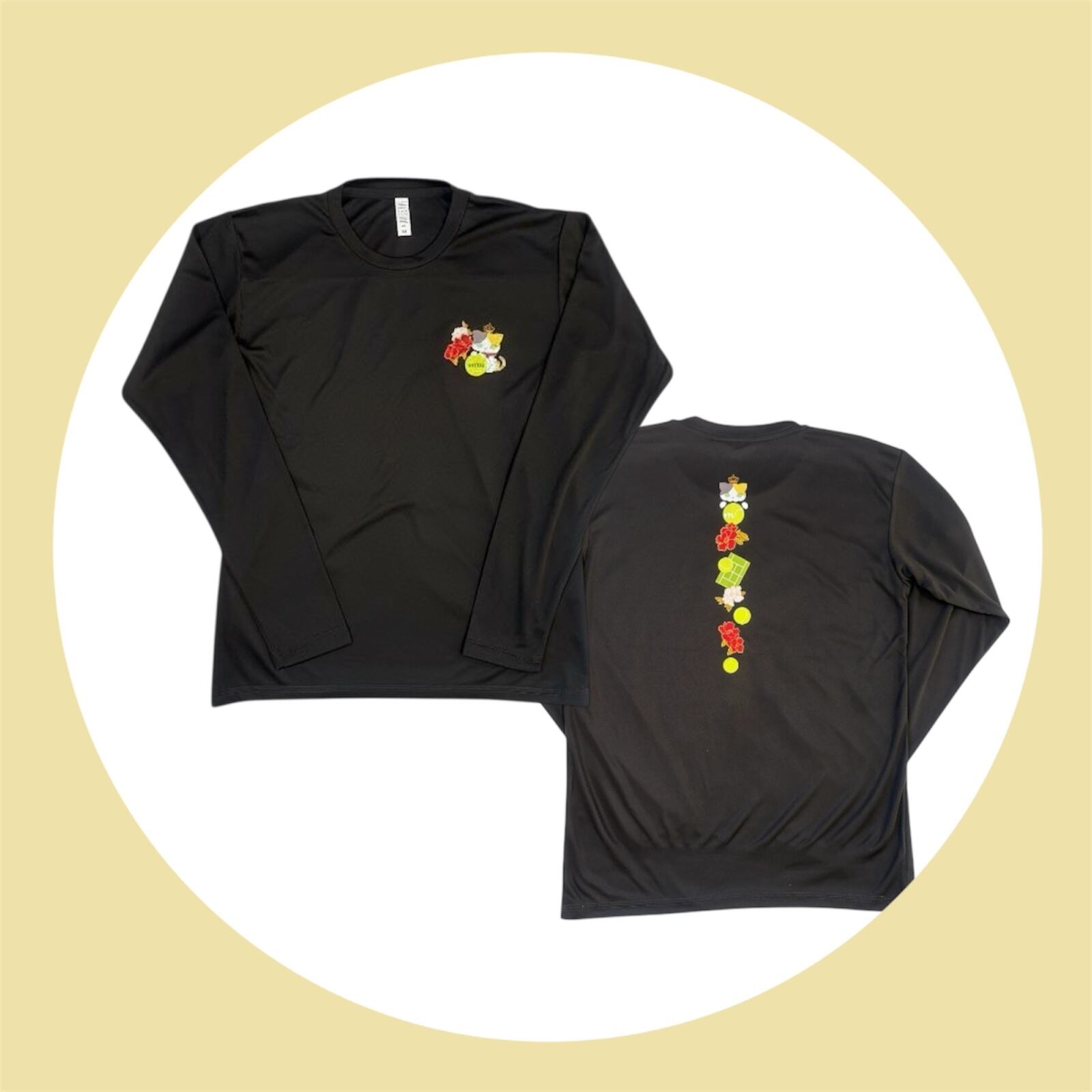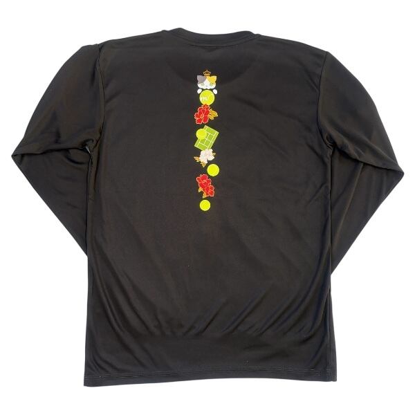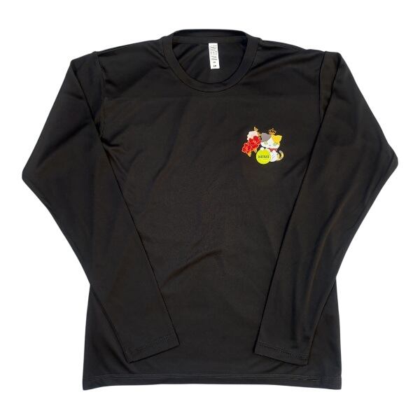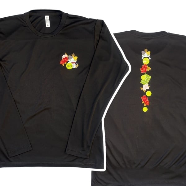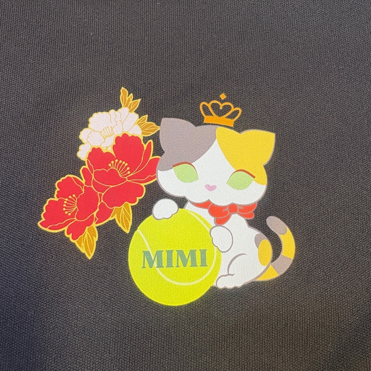 ミミポームオリジナルの三毛猫×テニス×和の融合、3.5ozインターロックドライ長袖Tシャツです。フロントはテニスボールを抱えた愛らしい「三毛猫」のワンポイント、バックプリントは三毛猫やテニスコート、鮮やかな赤い花が縦ラインに並んだデザインしてみました。肌触りの良い素材と、快適な着心地が魅力です。UV・ドライな機能を備えているので、汗を素早く吸収して、乾燥も早いんです。汗ばむ季節でもさらっと快適に過ごせますよ。