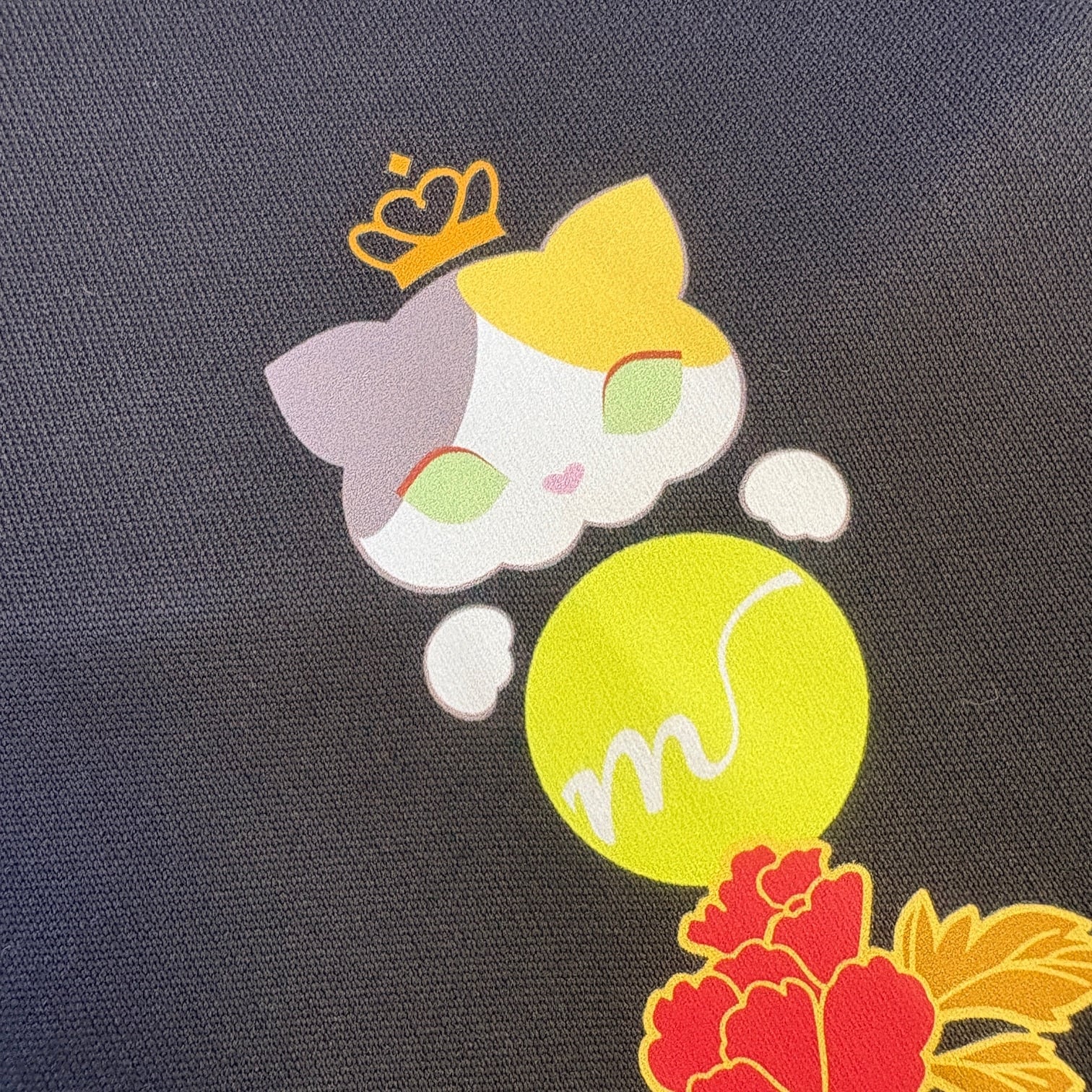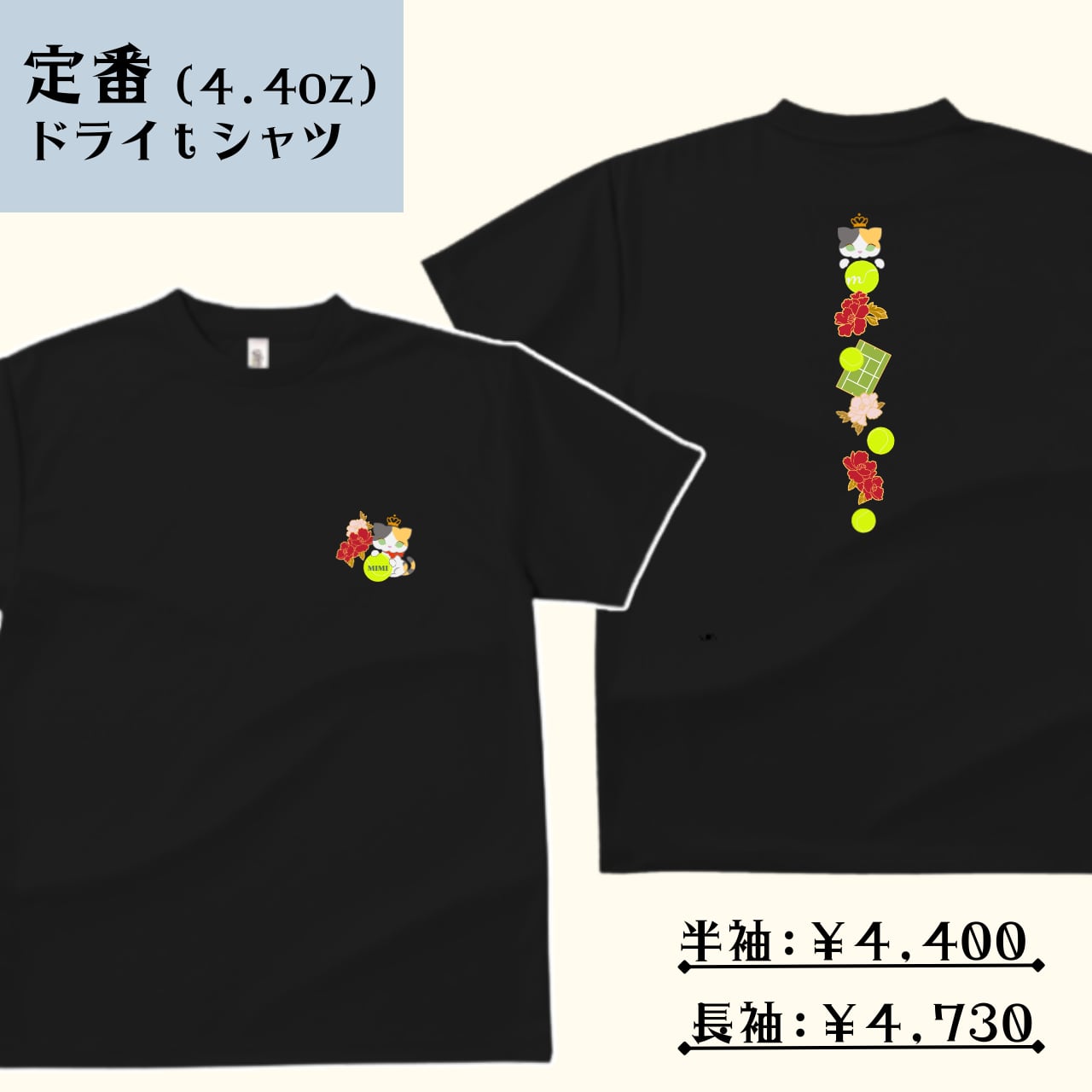 ミミポームオリジナルの三毛猫×テニス×和の融合、4.4ozドライTシャツです。フロントはテニスボールを抱えた愛らしい「三毛猫」のワンポイント、バックプリントは三毛猫やテニスコート、鮮やかな赤い花が縦ラインに並んだデザインしてみました。肌触りの良い素材と、快適な着心地が魅力です。UV・ドライな機能を備えているので、汗を素早く吸収して、乾燥も早いんです。汗ばむ季節でもさらっと快適に過ごせますよ。